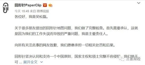 吴松磊在文中承认地图问题是“因工作失误而导致的严重问题”,自己是“主要责任人”。