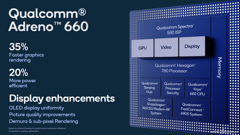 步入5G时代后,高通骁龙移动平台集成的GPU全部升级到了Adreno 6系,我们可以通过它们型号数字的大小判断性能强弱,目前最强的就是骁龙888集成的Adreno 660,最弱的则是骁龙730G(4G时代的“神U”)集成的Adreno 618。