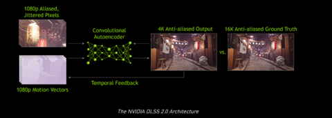 举例来说,比如原先是 4K 的游戏画质,在开启了 DLSS 之后,显卡会先去渲染 1080P 低分辨率的画质,与此同时用智能算法分析帧与帧之间的运动差异。