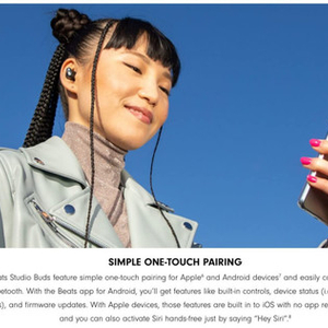 广告图片显示,一个模特拿着 Galaxy S21,耳朵里有一对 Beats Studio Buds,并提供以下广告语:Beats Studio Buds 的特点是为苹果和安卓设备进行简单的一键配对,并通过蓝牙轻松连接。通过安卓的 Beats 应用程序,你将获得内置控制、设备状态(即电池电量)和固件更新等功能。对于苹果设备,这些功能是内置在 iOS 系统中的,不需要应用程序,而且你还可以通过说“Hey Siri”来激活 Siri。