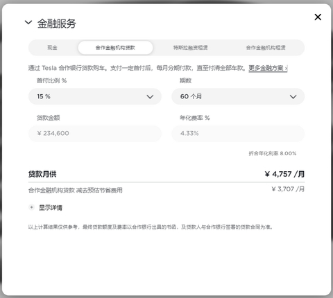 不仅省心,通过“置换有礼”活动购车,用户还可以直接用置换车款作为新车首付,并享受超低月供,真正“零负担”换新。以最新上市的Model Y标准续航版为例,用户可以在官网选择首付15%、60期还款的金融方案,即首付41400元、月供4757元(年化费率4.33%)。