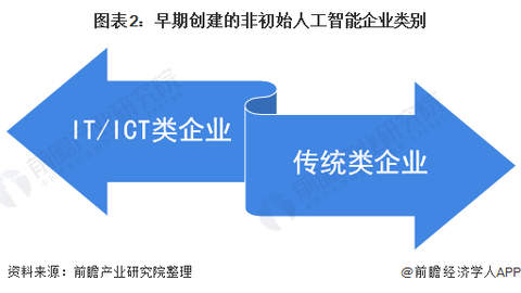 在早期,大部分企业不是人工智能企业,大多是2010年之后通过自主研发和引进人工智能技术进行转型升级从而成为人工智能企业,其中主要分为IT/ICT类企业和传统产业企业两类。
