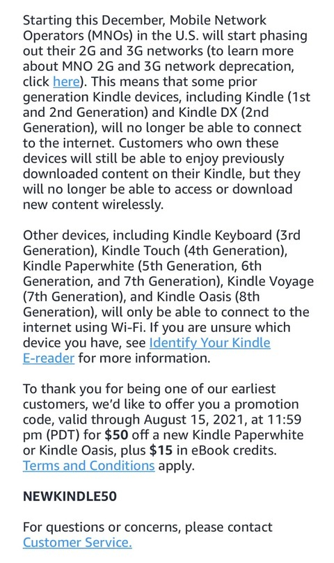 亚马逊在邮件公告中称,用户仍可继续观看在旧设备上已经下载的内容。但除非通过 Wi-Fi 连接,后续将无法通过移动互联网来访问 Kindle 商店并下载新书。