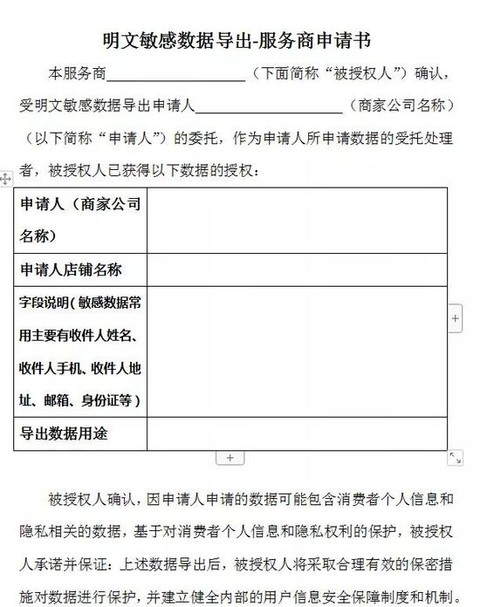 对此,在淘宝发布的公告中也有明确回复。回复表示,在店铺实际运营中,需要导出消费者的全部明文信息,可以前往“卖家中心”-“已卖出的宝贝”导出,或者通过填写“明文敏感数据导出-商家授权书”至服务商,由服务商向平台提交申请审核。平台审核通过后服务商会开通明文导出功能,商家可以通过服务商工具正常导出明文数据。值得注意的是,商家授权书有效期仅为30天,过期需要重新提交流程。
