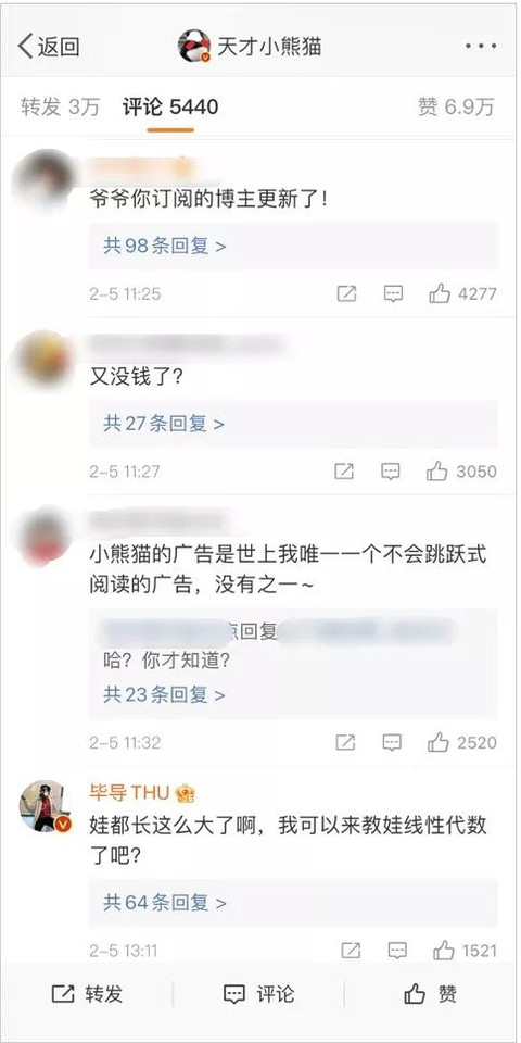 一般来说,天才小熊猫产出的内容,无论是图文还是视频都非常长,在流行“短平快”的微博内容时代,让用户读完本就是一件不容易的事。