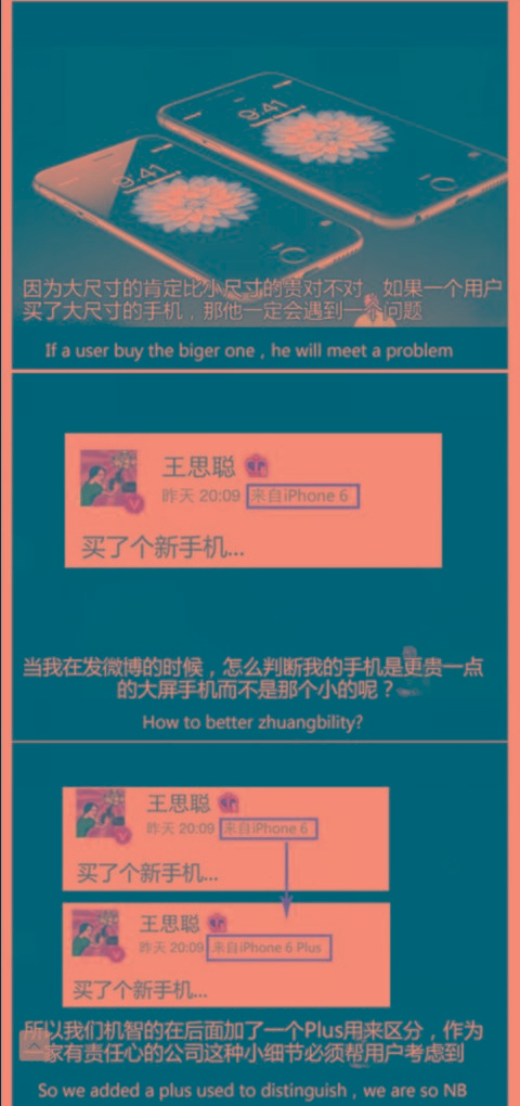 比如,2014年,他拿王思聪做梗,吐槽iPhone 6和iPhone 6 Plus的区别——为了满足用户装逼。
