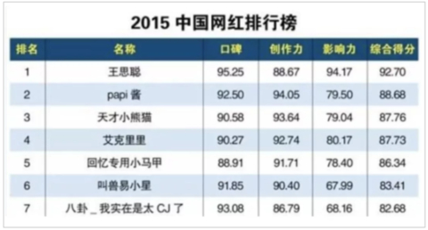 在2015中国网红排行榜上,他排第三,当年热度仅次于王思聪和papi酱。(图片来源:互联网周刊)