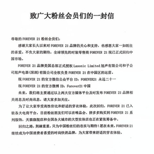 据悉,品牌官方微信公众平台粉丝现已完成迁移。该品牌表示,未来将主要通过官方微信公众平台“Forever 21永远二十一”以及官方微博“Forever21中国”两大官方媒体平台发布有关Forever 21品牌相关消息及时尚讯息。