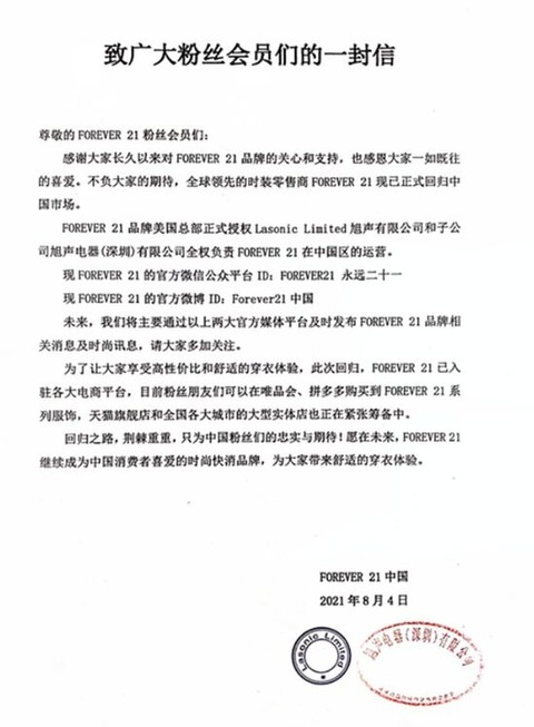快时尚品牌Forever 21于8月4日在官方微信公众号上宣布,品牌正式回归中国市场。Forever 21品牌美国总部正式授权Lasonic Limited旭声有限公司和子公司旭声电器(深圳)有限公司全权负责Forever 21在中国区的运营。
