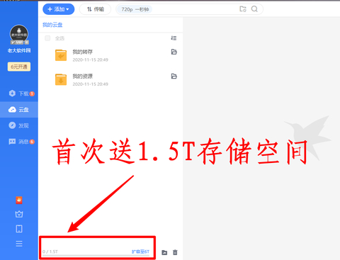 对于最新版的迅雷,已经加入云空间的功能,这个功能和百度网盘的功能一样,初次注册,赠送用户1.5T存储空间,在存储空间方面来说,已经不小了。
