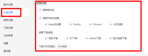 还可以对云盘进行一些设置,对于接管设置,可以设置迅雷从哪些浏览器中获取内容进行下载等等。但是支持的浏览器好像不是太多。