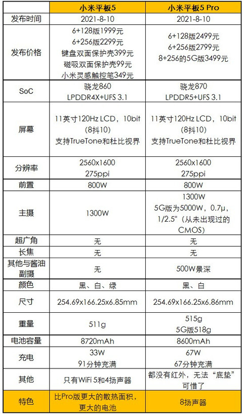 小米平板5 Pro是骁龙870,8600mAh电池+67W快充,8扬声器、有侧边指纹、Wi-Fi 6,6+128版2499元,6+256版2799元,8+256的5G版3499元。