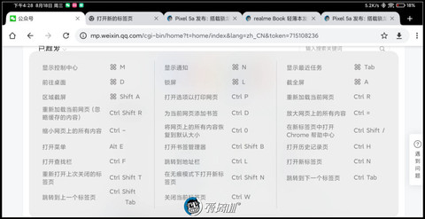 长按“任务键”可以看到当前APP中能用的快捷键列表,在Chrome里能看到一堆熟悉的快捷键。稍微熟悉一下快捷键,小米的键盘盖还是比较好用的。但没有触控板,日常得配无线鼠标,否则在桌面环境抬手触屏,还是很有锻炼效果的。