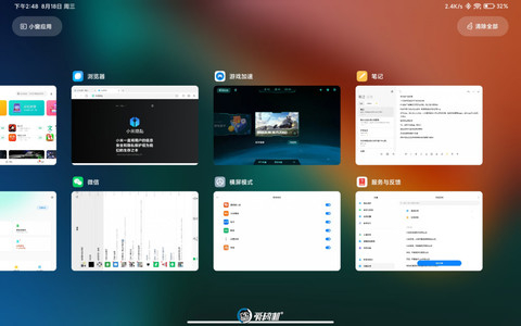 虽然UI很多苹果的影子,但dock栏却没有陈列后台app,也不能全局呼出,很是可惜。有小米手机上的小窗模式,分屏逻辑也和手机相近(多任务界面里进入分屏模式)。除左右分屏,还能额外添加两个浮动窗口(继续添加就会挤掉之前的APP)。系统横竖屏切换后,偶尔会有文字/元素遮挡等小bug,除此之外,稳定性还行。