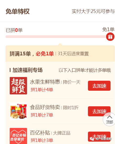 再看下拼多多的免单权益,这个权益有两个目的,一个是为提频设计,另一个是为活跃设计,也就是加速专场的功能。
