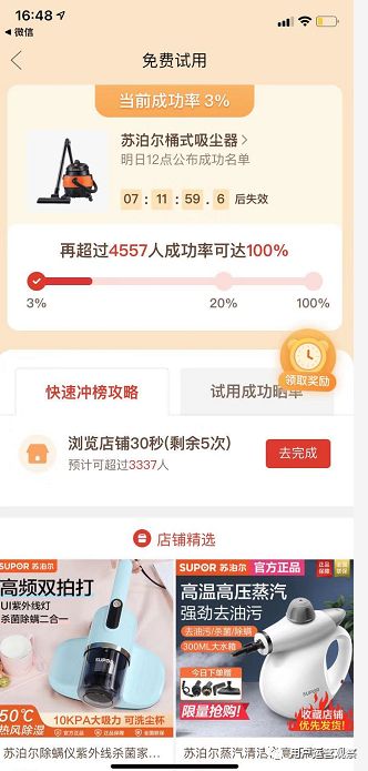 我们看到拼多多提供的免费试用产品有很多引流品,像苏泊尔吸尘器这类产品很容易激起用户免费领取的欲望。