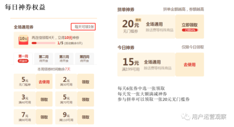拼多多针对留存的权益设计了两个,一个是每日神券,一个是免单特权。
