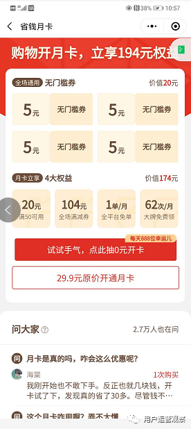 另一个要直面的问题是如何让用户愿意开卡,月卡会员的目标人群往往是高度敏感用户。