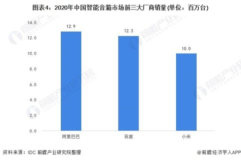 在2020年中国智能音箱市场上,阿里巴巴、百度和小米的销量共占市场份额超过95%,其中阿里巴巴销量位居第一,大致为12.9百万台;百度和小米分别以12.3百万台和10百万台左右的销量位列二、三。