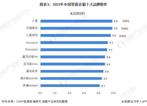 根据CNPP品牌数据研究最新发布的2021年智能音箱十大品牌榜单,百度旗下的小度、阿里旗下的天猫精灵以及小米科技旗下的小爱同学依次占据品牌前三的席位,与第四位的HomePod拉开0.4个点的品牌指数;科技巨头BAT中的腾讯旗下的腾讯听听则排在第八位。