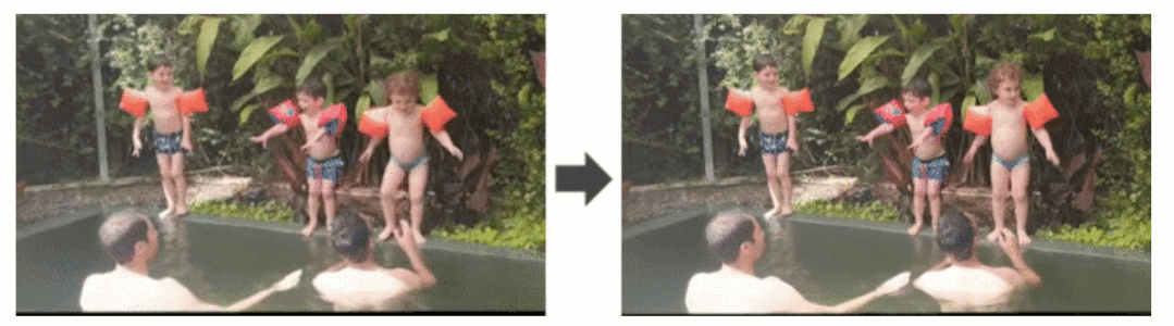 例如下面的三个主体被分解为三个层,通过简单地调整图层的回放速度,这些小孩儿最初的不同步的跳跃就能对齐,并且从水花的溅落和反射中也看不出修改的痕迹。
