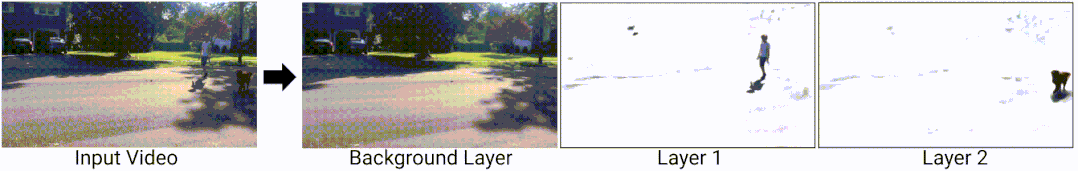 为了生成omnimatte,首先将输入的视频分成一组层: 每一个层用于一个移动的主体或是用于静止的背景物体。例如下图中可以看到,有一个图层用于人,一个图层用于狗,还有一个图层用于背景,当合并在一起使用传统的阿尔法混合方法,这些层可以重新合成这个输入视频。