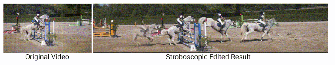 下图演示了如何删除和复制主体,视频已经被分解为一个omnimatte,并且马被复制了几次以产生频闪摄影效果,并且可以看到马投射在地面和障碍物上的阴影能够被正确捕捉。