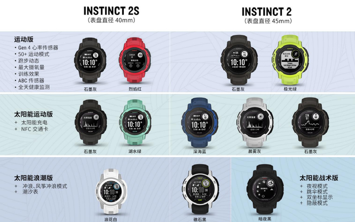 作为一款专业的户外手表佳明本能Instinct 2总共分为2和2S两款,其中佳明本能Instinct 2的规格整体高于佳明本能Instinct 2S,两款在表盘直径上是有所区别的,2的表盘为45mm适合男性用户,2S的表盘为40mm适合女性用户,为了更为细分领域,还分为太阳能浪潮版和太阳能战术版,两款分别在功能上相较于普通版多出了一些比较极限的使用模式,例如冲浪、隐蔽模式、跳伞等更为极限的活动。