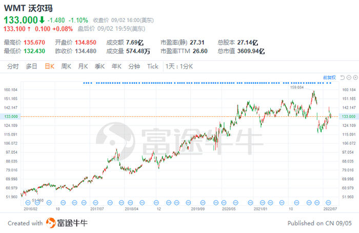 不过,沃尔玛的股价并非一路下挫,相反,其价格从2016年巴菲特大规模砍仓时的70美元一路震荡上扬,如今超过了130美元,累计上涨约90%。