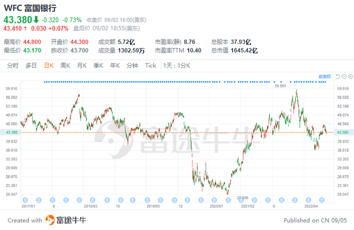 巴菲特特别喜欢银行股,而$富国银行(WFC.US)$曾经是巴菲特最爱。伯克希尔自1989年起就一直持有该只股票,其曾是富国银行的最大股东,持股市值一度高达320亿美元。