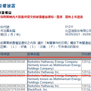 来源:港交所;图注:伯克希尔9月1日减持171.6万股比亚迪股份