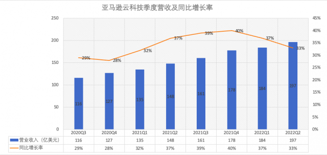 财务方面,2021年Q3至2022年Q2,亚马逊云科技的季度收入从161.1亿美元增长到197.4亿美元,季度增长率均保持在30%以上。