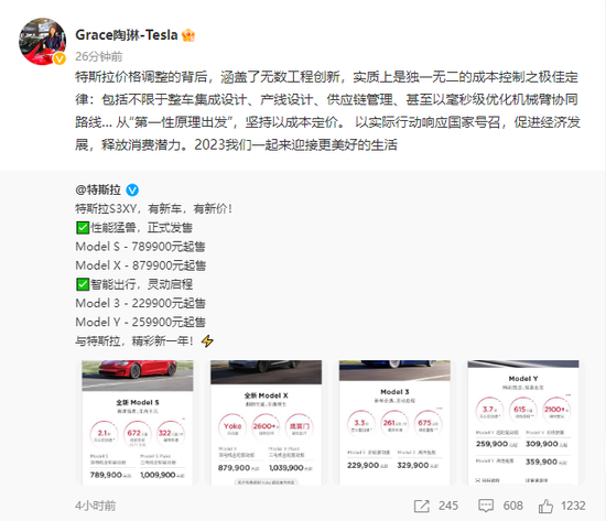 谈及最新的动作,特斯拉对外事务副总裁陶琳1月6日午间发布微博称,“特斯拉价格调整的背后,涵盖了无数工程创新,实质上是独一无二的成本控制之极佳定律:包括不限于整车集成设计、产线设计、供应链管理、甚至以毫秒级优化机械臂协同路线… 从‘第一性原理出发’,坚持以成本定价。”