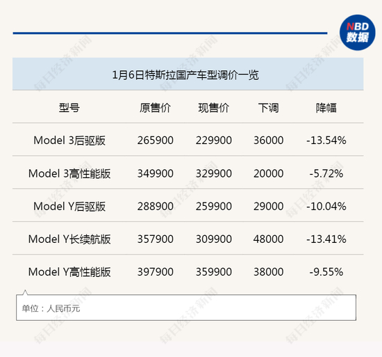 1月6日,特斯拉国产车型大幅降价,Model 3起售价22.99万元,降至历史最低价,如果以去年特斯拉首次降价前的价格来算,Model 3起售价的降幅已达5万元。Model Y起售价25.99万元。