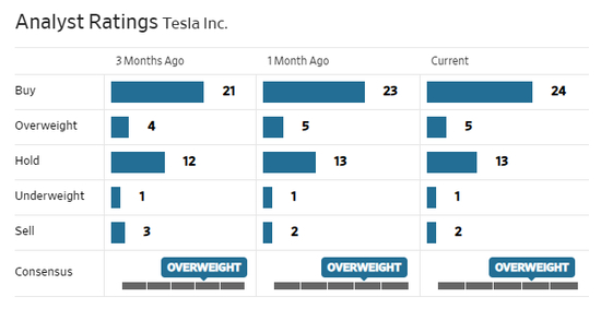 不过,据《华尔街日报》汇编的数据,截至目前,所有覆盖特斯拉的分析师中,有24人给出“买入”评级,有5人给出“超配”评级,有13人给出“持有”评级,有1人给出“低配”评级,另有两人给出“卖出”评级。整体来看,目前的评级与1个月和3个月前的评级差别并不大。