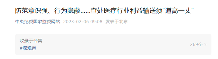 今天早上,中纪委官微突然发布题为《防范意识强、行为隐蔽……查处医疗行业利益输送须“道高一丈”》文章,直接点名医疗行业利益输送。