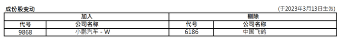 其中,恒生中国企业指数成分股将纳入小鹏汽车有限公司 - W.,剔除中国飞鹤有限公司。