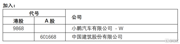 恒生沪深港通中国企业指数成份股数目维持在80只。纳入小鹏汽车有限公司 - W.和中国建筑股份有限公司;剔除中国飞鹤有限公司和美的集团股份有限公司。