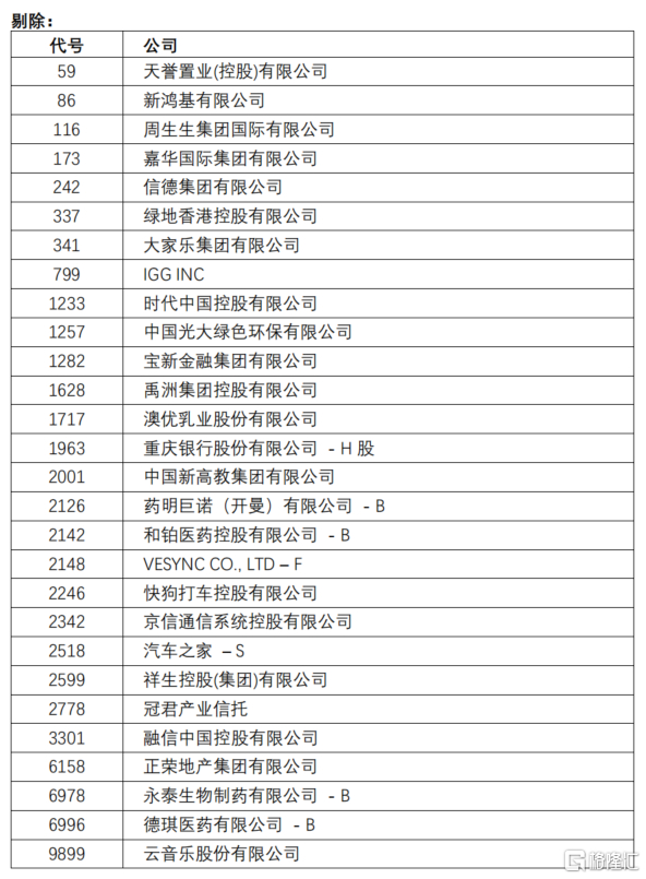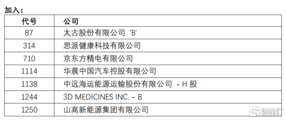其中,太古股份、思派健康、京东方精电、华晨中国、中远海运、3DMEDICINESINC、山高新能源等35只股将被纳入;天誉置业、新鸿基、周生生、嘉华国际等28只股将被剔除。