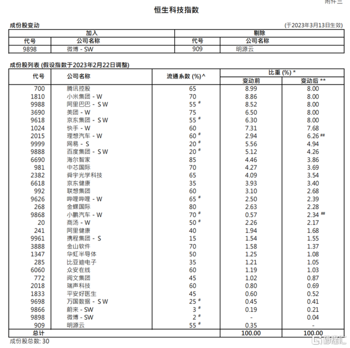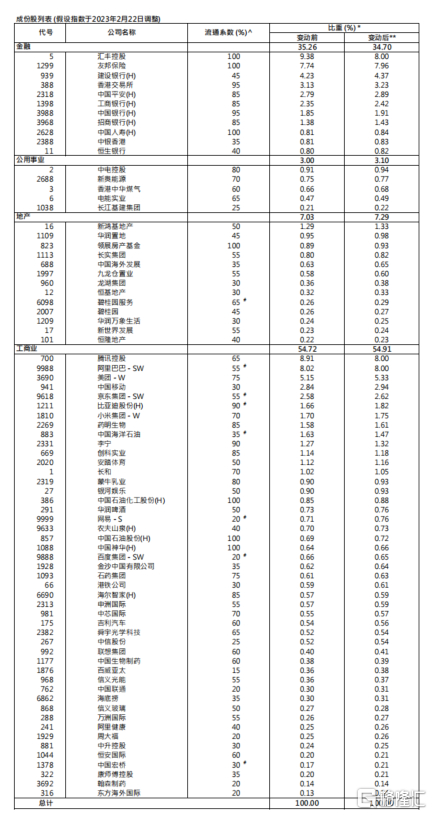 2月24日,恒生指数有限公司公布截至2022年12月31日之恒生指数系列季度检讨结果,所有变动将于2023年3月13日(星期一)起生效。