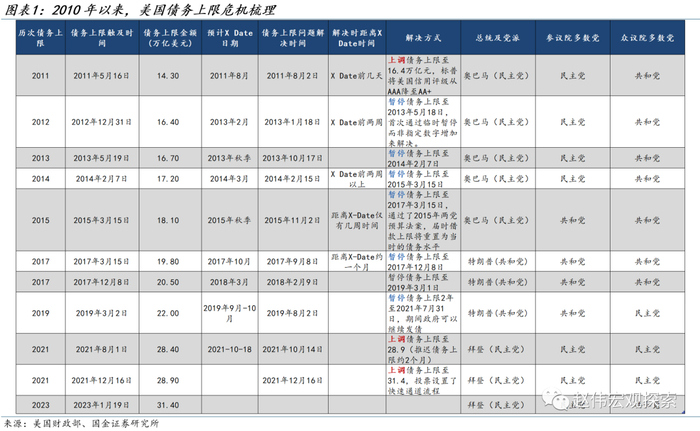 尽管未曾出现过实质性违约,但债务上限危机通过影响市场预期、风险偏好、干扰流动性、影响借贷成本等机制作用于实体经济和金融市场。1960年以来,美国政府共计78次提高债务上限,大约每8个月上调一次。近三十年来出现了三次影响较大的债务上限调整事件,分别是1996年克林顿政府停摆,2011年奥巴马政府债务上限危机,2013年美国政府停摆。2011年8月初,美国因债务上限之争几乎导致政府停摆,共和党占多数的众议院要求时任总统奥巴马削减一系列支出,以换取提高债务限额。在财政部估计限额将用尽的两天前,奥巴马最终与国会的共和党议员达成协议,共和党人同意提高上限,以换取未来一揽子的开支削减,在8月2日以74票对26票通过议案,奥巴马签署议案,结束债务上限危机。
