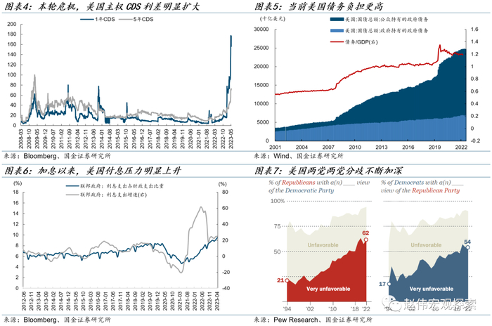 本轮债务上限危机出现了有别以往的新特征,市场担忧情绪更强,美国债务压力更高,银行业风险仍在扩散,两党的分歧也更大。新特征主要体现在以下方面:第一、市场情绪明显更加脆弱,金融市场已经通过更高的风险溢价开始定价政府违约。美国1年期、5年期主权CDS 利差快速攀升,已超过2008、2011及2013年的高点。第二、美国银行业风险仍然在蔓延;第三、当前美国债务压力更高,美国政府债务占GDP比重达到120%,利率上行引起美国债务付息压力增大,4月利息支出增速(12MMA)达到24%、利息支出占财政支出比重接近10%;第四、美国两党间的分歧较以往更加严重。疫情后,两党对彼此的看法越来越负面,2022年,62%的共和党人对民主党持有负面看法,54%的民主党人同样对共和党不满。这些新特征可能导致本轮债务问题更复杂。