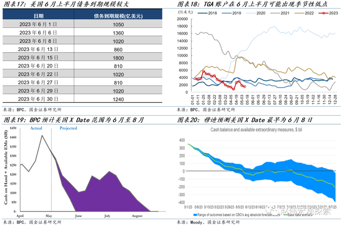 从财政部可用资金来看,X Date最早可能出现在6月上半月。资金余额方面,今年财政部TGA账户余额低于往年水平。4月税收缴款后,TGA账户新增仅约1700亿,去年同期新增达3700亿。截至2023年5月3日,财政部现金约1880亿,加上1150亿美元的特别措施余额,总计约3030亿。资金支出方面,6月1日至6月15日,美国财政部将有约6000亿美元的债务到期;六月份财政部需现金支出至少3260亿,上半月约1630亿,且6月上半月由于支出较大,往往形成现金低点。结合现有余额看,5月尚能度过,但6月上半月将面临“入不敷出”的考验。海外给出的预测结果方面,BPC预测可能为6月初至8月,穆迪预测可能为6月8日,耶伦警告最早为6月1日。