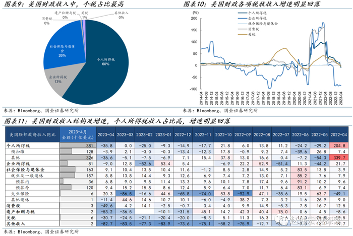 美国财政收入方面,个人所得税占比最高,各项收入增速均已明显回落。美国财政收入以税收为主,主要包括个人所得税、企业所得税、社保缴费、消费税、遗产税、关税等。个人所得税收入占比约50%,是收入主要来源;企业所得税占比约7%;社保缴费占比约36%。2022年以来,美国财政各项收入增速均明显回落,截至4月,个人所得税同比增速降至-36%、企业所得税-37%、消费税-50%,占比最大的个税增速回落幅度较大。
