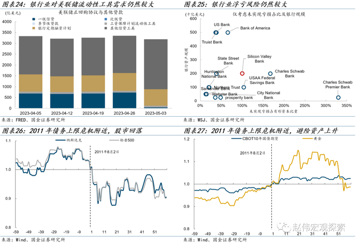 在该情景下,对实体经济而言,经济预期和消费者信心可能回落;黄金等避险资产回报上升;股票等风险资产回落。但今年新的风险在于债务上限危机可能加大银行业冲击。主要体现在:(1)短期内国债利率上升可能使银行浮亏进一步扩大;(2)银行以国债作为抵押品向美联储借款,国债信用受质疑可能使银行业流动性恶化;(3)为寻求安全资产,投资人可能会从国债市场逃离,通过货币基金流入ON RRP,加速银行存款挤兑。