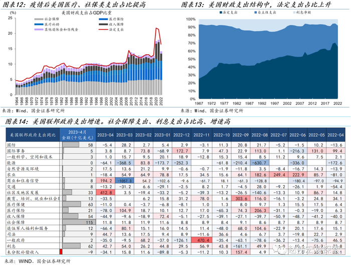 美国财政支出方面,疫情后财政刚性支出占比提高,利息支出压力上升,整体支出增速仍然较高。美国财政支出包括社会保障、医疗、收入保障、国防、利息支出等,其中社会保障支出占比最高,达25%,医疗保健占比13.7%、利息支出占比13.5%,收入保障占比12%。与疫情前相比,美国社保、医疗保健等法定支出明显抬升,占总支出比重已超60%。利息支出压力同样上涨,4月利息支出620亿美元,已超出国防支出的580亿美元。结构的变化导致政府支出增速难以降低,2022年6月以来,支出端增速整体高于收入增速,使得财政赤字扩大,美国今年3月赤字增速高达96%。
