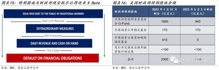 美国债务上限X Date预计何时到来?具体日期取决于美国特别措施余额和财政部现金。X Date是指美国在达到债务上限后,财政部耗尽所有可行措施的日期,届时,美国政府将无法全额支付各项开支,X Date后,美国将可能出现主权违约。从特别措施(Extraordinary Measures)来看,现阶段美国财政部实施的措施包括:(1)暂停投资联邦雇员退休金G-Fund;(2)暂停投资汇率稳定基金;(3)暂停投资公务员和邮政退休基金;(4)发行并交换来自联邦融资银行的证券。截至1月31日,特别措施可腾挪的资金额约为2300亿美元,截至5月3日已消耗至1150亿美元。
