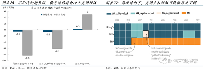 该情景下,两党各自态度强硬,谈判无法取得有效进展,拖延到X Date之后,政府可能出现停摆,美国接近违约甚至出现短期的实质性违约,双方最终在市场压力下让步,暂停、提高上限;总统也可能动用宪法权力强行发债。类似情形历史上未曾出现,经济和市场严重性可能高于2011年。根据美国白宫的测算,长期违约(违约持续数周)将使美国三季度就业岗位减少800万个、GDP下降6.1个点、失业率上升5个百分点;短期违约(违约持续数天)也会使美国三季度就业岗位减少50万个、GDP下滑0.6个点、失业率上升0.3个点。一旦违约,美国主权债务评级将可能被再次下调。