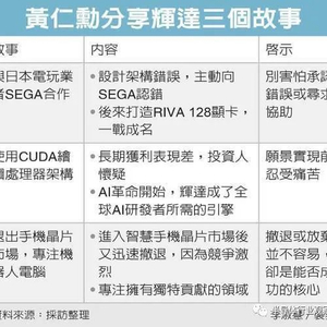 黄仁勋说,英伟达的第一个产品是计算机游戏用的3D显卡,想与日本电玩业者SEGA合作,但一年后发现设计架构错误,要是持续下去,做出来的SEGA游戏主机技术落后,并与Windows不兼容。黄仁勋被迫向SEGA执行长解释,英伟达无法继续合约,希望SEGA另寻合作对象,但又希望SEGA能全额付款,否则英伟达就会倒闭。