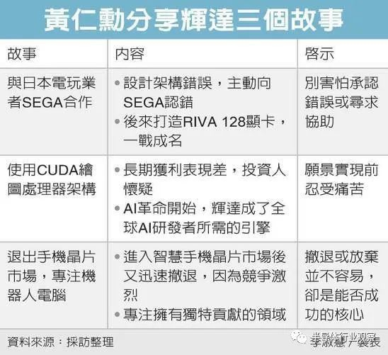 第三个故事是,英伟达进入智慧手机芯片市场后又迅速撤退,因为竞争激烈,‘我们做出了艰难的决定,牺牲这块市场’,英伟达的目标是打造新计算机,‘我们应该投身于我们要拥有独特贡献的愿景’。退出手机市场做法奏效,英伟达转向发展机器人计算机,如今在自动化和机器人运算领域生意高达数十亿美元。